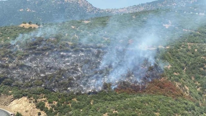 İzmir Orman Bölge Müdürlüğüne bağlı iki uçak ve iki helikopterle müdahale edilen yangına 11 arazöz, 7 su ikmal ve 1 dozer de karadan müdahale etti. Yangını kontrol altına alma çalışmaları sürüyor.