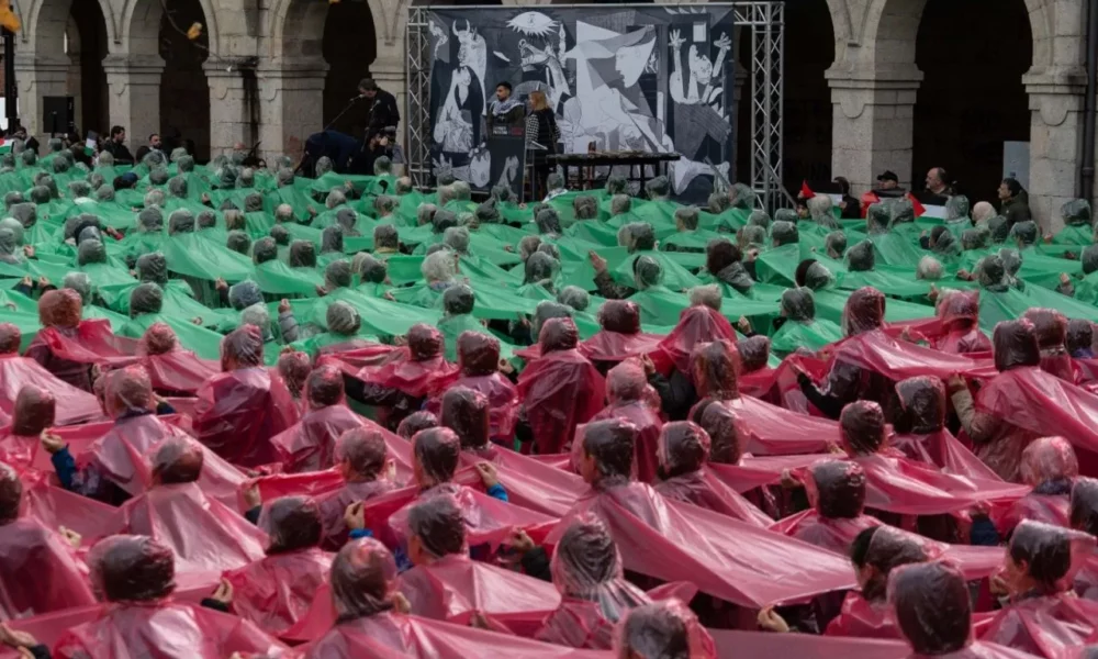 İspanya İç Savaşı’nın sembolik mekanlarından, ünlü ressam Pablo Picasso’nun tablosunu yaptığı, 1937 yılında Alman ve İtalyan hava kuvvetlerince bombalanan Guernica kasabasında Filistin’e destek için yüzlerce kişi tarafından insan mozaiği oluşturuldu. Eylemde, Guernica’nın yeniden yaşanmasına, tarihin tekerrür etmesine izin verilmemesi gerektiği vurgulandı.