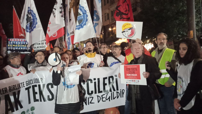 BİRTEK-SEN üyesi Özak Tekstil işçilerinin direnişi 20. gününde. İstanbul’da bir araya gelen 16 sendika Kadıköy Süreyya Operası önünden işçilerin haklı mücadelesini selamladı, dayanışma çağrısını yükseltti.
