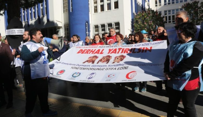 İzmir’de bulunan sağlık meslek örgütleri, hastanelerde fazla nöbet, fazla mesai ve icap nöbetlerinin ücretlerinin yatırılması talebiyle Ege Üniversitesi Hastanesi Başhekimliği önünde basın açıklaması yaptı. “Sağlık emekçilerini duymayan, görmeyen, konuşmayanlara sesleniyoruz; yönetemiyorsunuz, istifa edin” pankartı açılan açıklamada, “Sadaka değil hakkımızı istiyoruz”, “Kurtuluş yok tek başına ya hep beraber ya hiçbirimiz” ve “İnsanca bir ücret istiyoruz” sloganları atıldı. Açıklamaya çok sayıda sağlık çalışanının yanı sıra kentte bulunan siyasi parti ve kurum temsilcileri de katıldı.