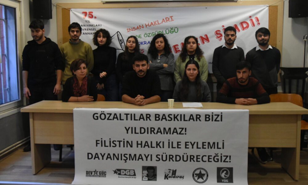 Gençlik örgütleri, Filistin’de süren direnişe destek olmak ve İsrail’le tüm ticari ilişkilerin kesilmesini talep etmek amacıyla 18 Aralık’ta Ambarlı Limanı’nda gerçekleştirmek istedikleri eylemin yasaklanması ve polis saldırısına ilişkin İnsan Hakları Derneği (İHD) İstanbul Şubesi’nde basın toplantısı düzenledi.