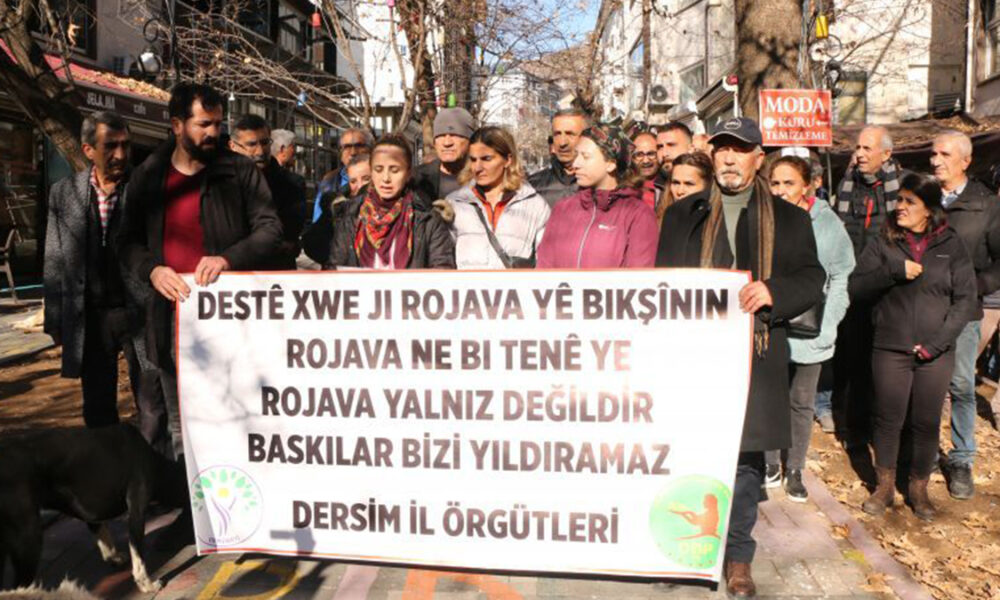 Türkiye’nin Kuzey ve Doğu Suriye’ye yönelik saldırılarına karşı Halkların Eşitlik ve Demokrasi Partisi (DEM Parti) Dersim İl Örgütü Sanat Sokağı’nda basın açıklaması gerçekleştirdi. “Deste xwe ji Rojava yê bikşînin Rojava ne bi tenê ye/ Rojava yalnız değildir baskılar bizi yıldıramaz” yazılı pankartının açıldığı açıklamaya çok sayıda kişi katıldı.