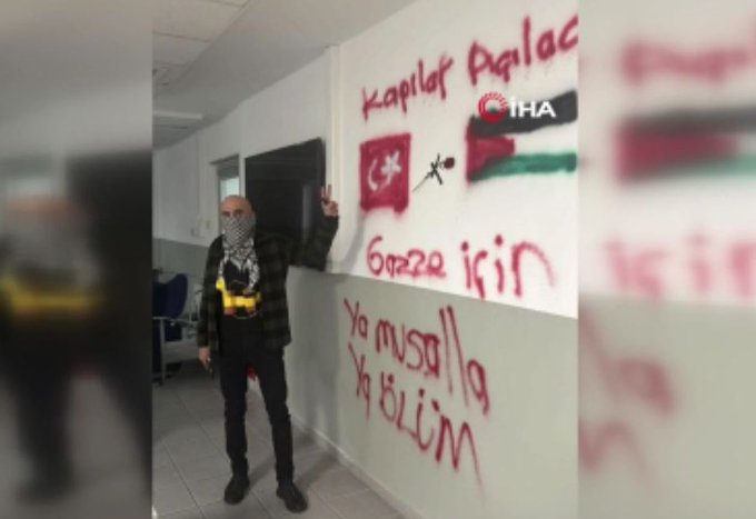 Fotoğrafta yüzünü Filistin poşusuyla kapatan, üzerinde bomba düzeneğini andıran düzenek olan kişinin elinde tabanca ile poz verdiği görüldü. Fotoğrafta şüphelinin duvara sprey boyalarla da ‘Kapılar açılacak. Gazze için ya musalla ya ölüm” yazdığı ve Türkiye bayrağı ile Filistin bayrağı çizdiği görüldü.