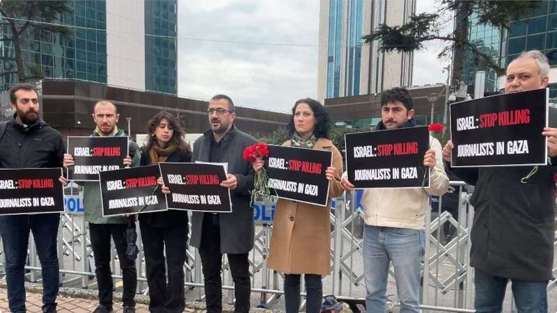 İsrail Başkonsolosluğu önünde yapılan açıklamada, sivillerin yanı sıra görevi başındaki 92’si Filistinli, 4’ü İsrailli ve 3’ü Lübnanlı olmak üzere 99 gazeteci ve medya çalışanının katledildiği kaydedildi. Çatışma ve savaş zamanlarında sivil halka yönelik ihlalleri belgeleyen ve tüm dünyaya duyuran gazetecileri hedef almanın bir savaş suçu olduğu vurgulanan açıklamada, “Türkiye Gazeteciler Sendikası olarak bu çatışma ortamının derhal son bulması, sivillerin ve gazetecilerin hedef alınmaması için tüm ülkeleri göreve çağırıyoruz. Kamu yararı için çalışan gazetecileri hedef alıp öldüren sorumluların derhal yargılanmasını ve cezalandırılmalarını talep ediyoruz” denildi.