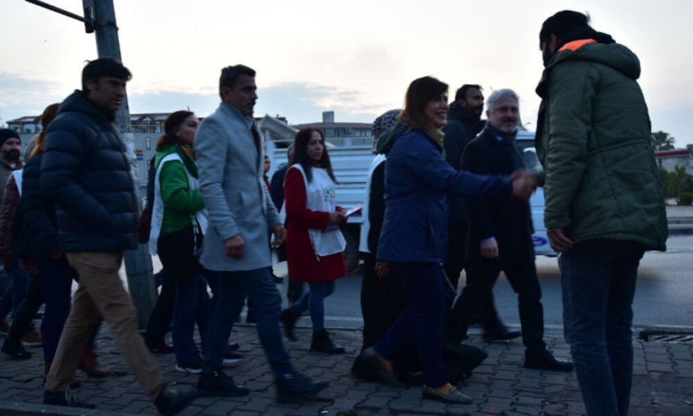 Burada bir süre işçilere bildiri dağıtıldıktan sonra Tuzla Gemi Tersanesi önüne yürüyüşe geçildi. Yol boyu bildiri dağıtılırken ve işçilere yönelik konuşmalarda DEM Parti’nin politikaları anlatılırken Beştaş ve Çepni de servis bekleyen işçilerle sohbet etti.