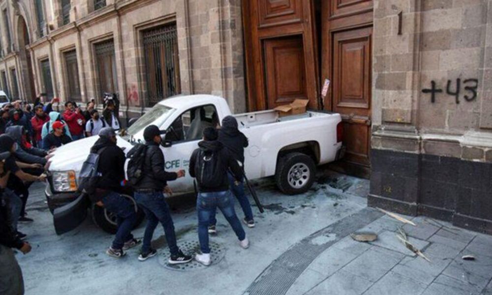 Meksika’da “Ayotzinapa Davası” ismiyle bilinen ve 43 öğrencinin 2014’te devlet güçleri-mafya ortaklığıyla gözaltına alındıktan sonra kaybedilmesini protesto eden göstericiler Devlet Başkanı Andres Manuel Lopez Obrador’un günlük basın toplantısı sırasında Ulusal Saray’ın kapısını kamyonla kırdı