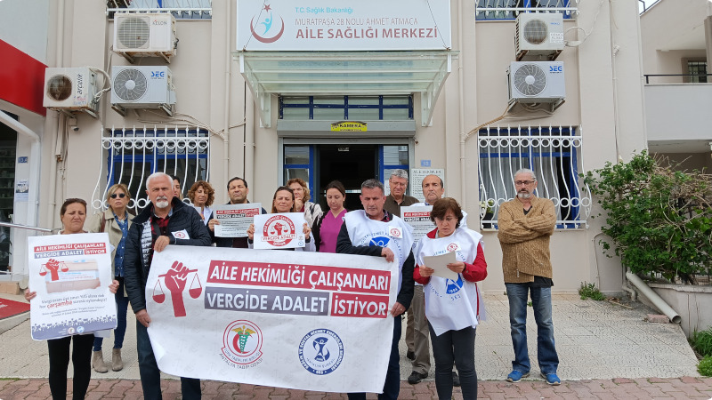 Antalya’da Muratpaşa 28 Nolu Ahmet Atmaca Aile Sağlığı Merkezi önünde, “Aile hekimliği çalışanları vergide adalet istiyor” pankartıyla bir aray gelen emekçiler aynı talepli dövizler de taşıdı. Basın metnini Şükran İçöz okudu.