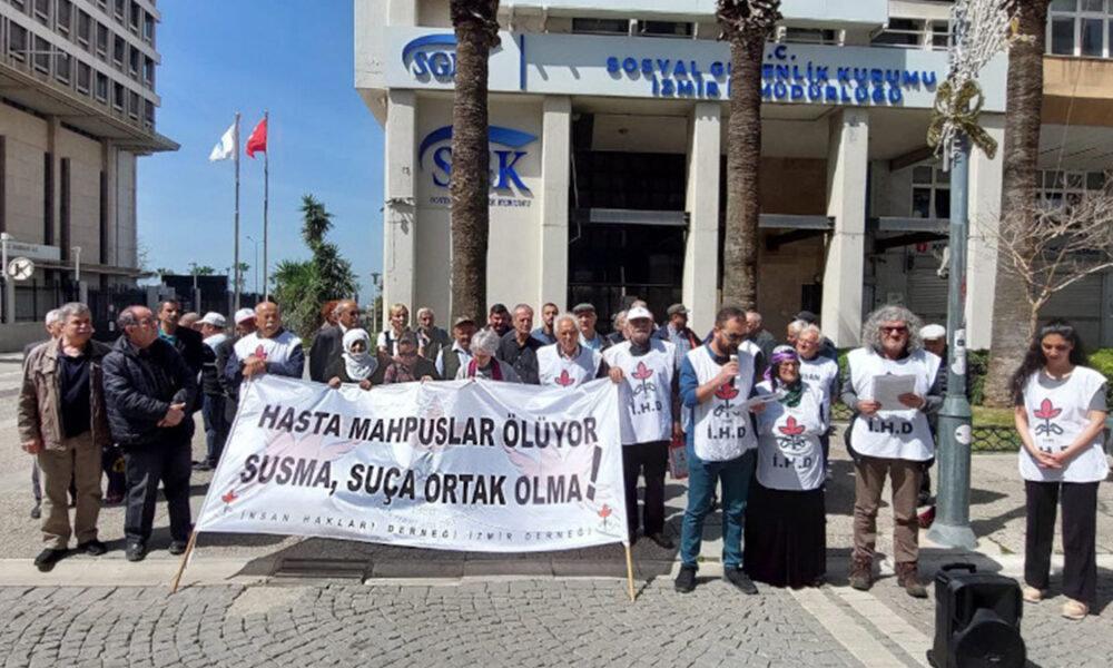 İnsan Hakları Derneği (İHD) İzmir Şubesi, hasta tutsakların durumuna dikkat çekmek amacıyla Konak eski Sümerbank önünde yan yana geldi. “Hasta mahpuslar ölüyor, susma suça ortak olma” pankartı açılan eylemde, basın açıklamasını Ali Aydın okudu.