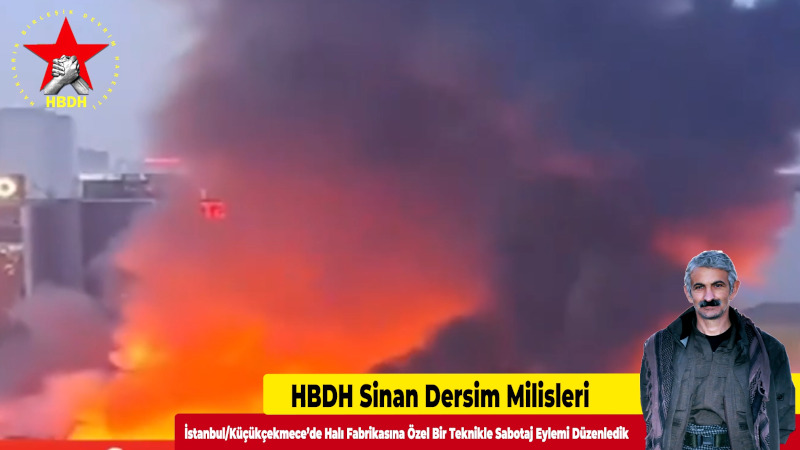 Halkların Birleşik Devrim Hareketi Sinan Dersim Milisleri, İstanbul Küçükçekmece’de bulunan bir halı fabrikasına özel teknikle sabotaj eylemi düzenlediklerini duyurdu. Eylemin 29 Mart sabahı 06.00 sıralarında yapında belirtilen açıklamada, ateşe verilen fabrikada büyük hasar oluştuğu da aktarıldı.