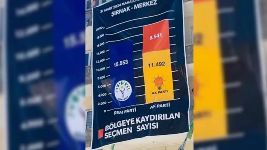 Mezopotamya Haber Ajansı’nda yer alan habere göre, pankartta, DEM Parti’nin oy sayısının 15 bin 553, AK Parti’nin 11 bin 492 ve taşımalı asker sayısının ise 6 bin 541 olduğu belirtildi.