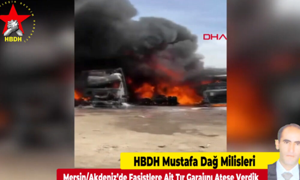 Bu kapsamda harekete geçtik. HBDH Mustafa Dağ Milisleri olarak, Mersin/Akdeniz ilçesinde faşistlere ait olduğunu tespit ettiğimiz bir tır garajını özel yöntemler kullanarak ateşe verdik. Tırlar dan 6 tanesi küle dönerken onlarca tır da maddi hasar oluştu.