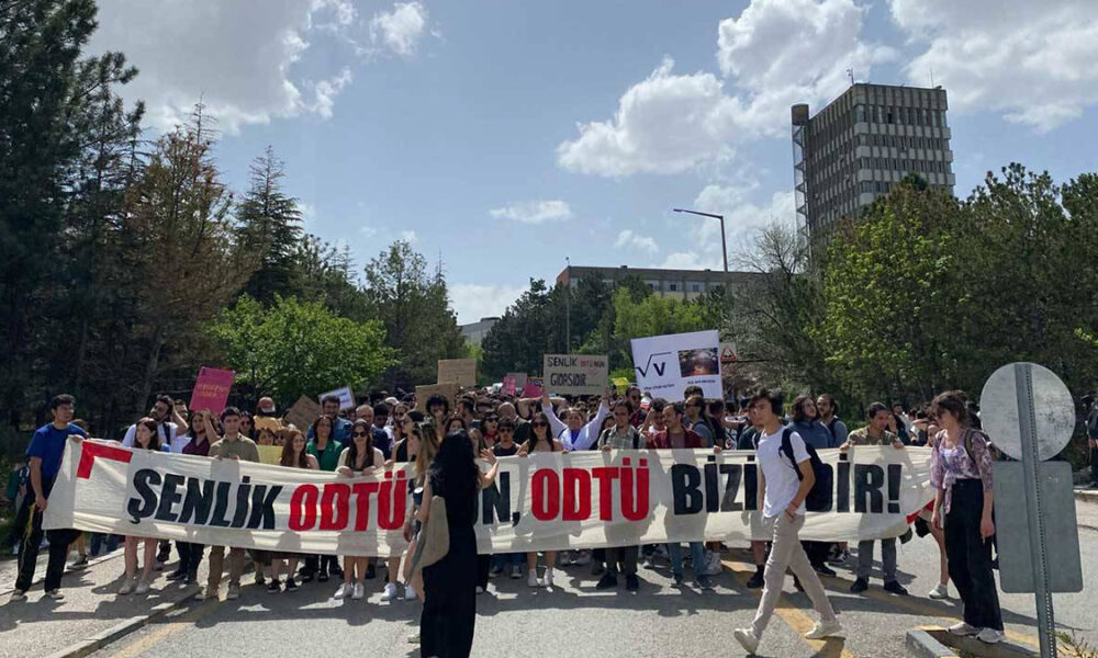 ODTÜ öğrencileri, Geleneksel Bahar Şenliği’nin kayyum rektör Verşan Kök tarafından Devrim Stadyumu’nda yapılmasının engellenmesine karşı rektörlük binasına yürüdü
