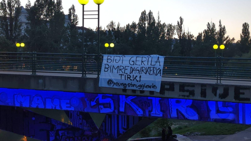 Türkiye’nin Medya Savunma Alanları’na yönelik saldırısına yanıt olarak Avusturya’nın başkenti Viyana’da sosyalist gençler pankart astı.