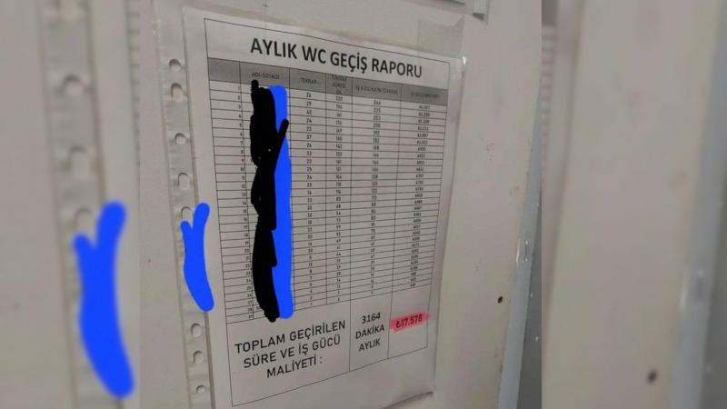 Türkiye’de bir işyerinde patron, işçilerin bir ay boyunca tuvalette geçirdiği zamanı ve kendisinin sözde maliyet zararını hesaplayarak tuvaletin kapısına astı.