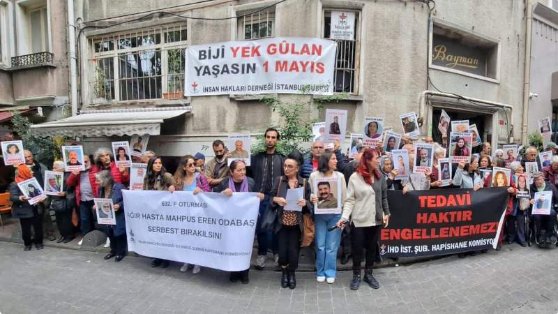 Sık sık, “Eren Odabaş serbest bırakılsın”, “Hasta mahpuslar serbest bırakılsın!”, “Tedavi haktır engellenemez” sloganlarının atıldığı; “632. F Oturması. Ağır hasta mahpus Eren Odabaş serbest bırakılsın” ve “Tedavi haktır engellenemez” pankartlarının açıldığı, hasta tutsakların fotoğraflarının taşındığı eylemin metnini İHD Eş Genel Başkanı Eren Keskin okudu. Hasta tutsak Eren Odabaş’ın bacağında oluşan desmoid tümör ve kalp sinyal bozukluğu ya da kalp iletim bozukluğu da denen ve kalbin her an durma riski taşıması anlamına gelen Uzun QT Sendromu (LQTS) hastası olup, tedavisi devam ederken 10 Şubat 2024 tarihinde tutuklandığını hatırlatan Keskin, “Bu süreçte rutin kontrol ve tedavileri kesilmiş, bu durum hastalıklarının hızla ilerlemesine ve hayati riske neden olmuştur. Hakkında somut bir delil olmadığı ve sadece bir gizli tanık ifadesine dayanılarak tutuklandığı belirtilen Eren Odabaş; 2016 yılından bu yana bacağındaki tümör nedeni ile tedavi görmekte olup, son BT raporunda; lenflerinde (koltukaltı ve kasıklarda) nodül büyümesi, tümörde büyüme ve aynı bölgede kemik büyümesi görüldüğü ve hayati riskinin olduğu belirtilmiştir. Tedavisi Çapa Onkoloji Ana Bilim Dalı’nda yürütülen Odabaş tutuklandıktan sonra Sincan’a gönderilmiş, İstanbul dışında bir hapishaneye sevk edilmiş olması ve hastane değişikliği, tedavi sürecinin kesilmesine neden olmuştur” dedi.