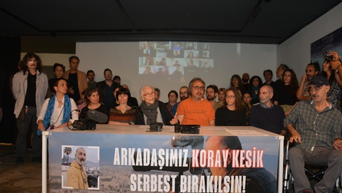 İzmir’de dün gözaltına alınan görüntü ve sanat yönetmeni Koray Kesik’in meslektaşları, İstanbul Beyoğlu’nda bulunan Aznavur Karşı Sanat Merkezi’nde açıklama yaptı. İnsan Hakları Derneği yöneticileri ile çok sayıda hak savunucusu da açıklamaya katıldı.