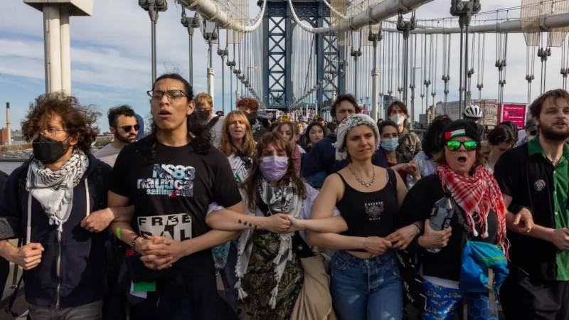 Amerika Birleşik Devletleri’nin New York eyaletinde yüzlerce kişi Filistin halkıyla dayanışmak için ve siyonist İsrail’in soykırım politikalarına karşı Manhattan Köprüsünü trafiğe kapattı.