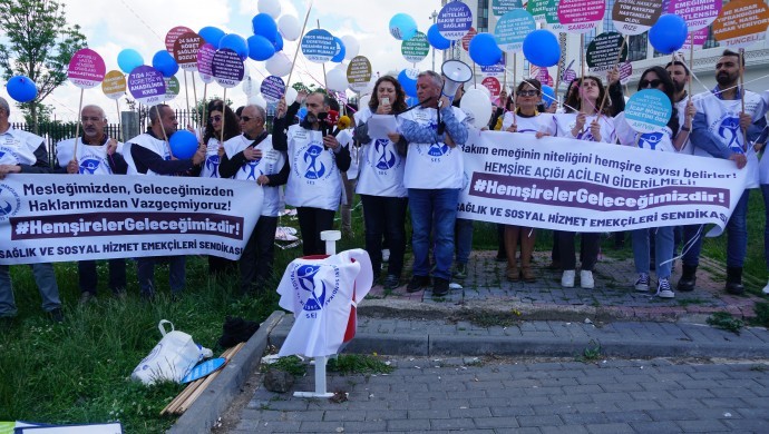 Sağlık ve Sosyal Hizmet Emekçileri Sendikası12 Mayıs Hemşireler Günü’ne ilişkin açıklama yaptı. Sağlık Bakanlığı’nın önünde yapılan açıklamaya Kamu Emekçileri Sendikaları Konfederasyonu ve bağlı iş kollarının yanı sıra Emek Partisi Milletvekili Sevda Karaca katıldı. “Mesleğimizden, geleceğimizden haklarımızdan vazgeçmiyoruz” ve “Bakım emeğinin niteliğini hemşire sayısı belirler! Hemşire açığı acilen giderilmeli” pankartlarının açıldığı eylemde açıldığı “İnsanca yaşamak istiyoruz” ve “Yaşamak yaşatmak istiyoruz” sloganları atıldı.