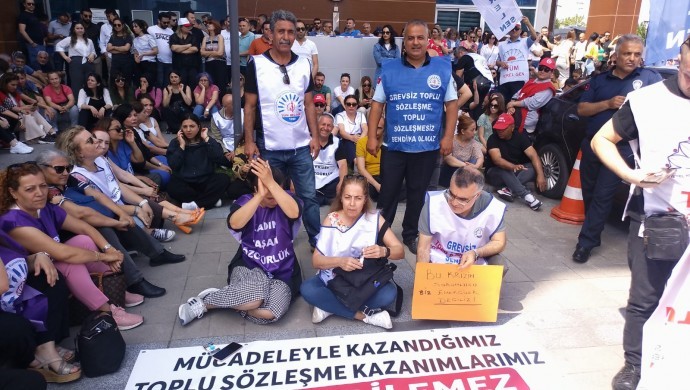 İzmir Bayraklı Belediyesi’nde çalışanlarının maaşlarından sosyal haklarına yönelik kesinti yapılmasına tepkiler devam ediyor. Kesintinin iadesi talebiyle 14 Mayıs’ta belediye binası önünde eylem başlatan çalışanlar, hafta içi her gün oturma eylemi yapıyor. Çalışanlar, “Mücadeleyle kazandığımız toplu sözleşme hakkımız gasp edilemez” pankartı ve “Krizin sorumlusu emekçiler değil” dövizleri taşıdı. İşçiler eylem sırasında sık sık “Sermayeye köle olmayacağız”, “Susmuyoruz, korkmuyoruz, itiraz etmiyoruz” ve “Yaşasın örgütlü mücadelemiz” sloganları attı. Eyleme Genel İş üyesi temizlik işçileri de destek verdi. Çöp kamyonlarını belediye binası önüne getiren işçiler, uzun süre yol kapattı.