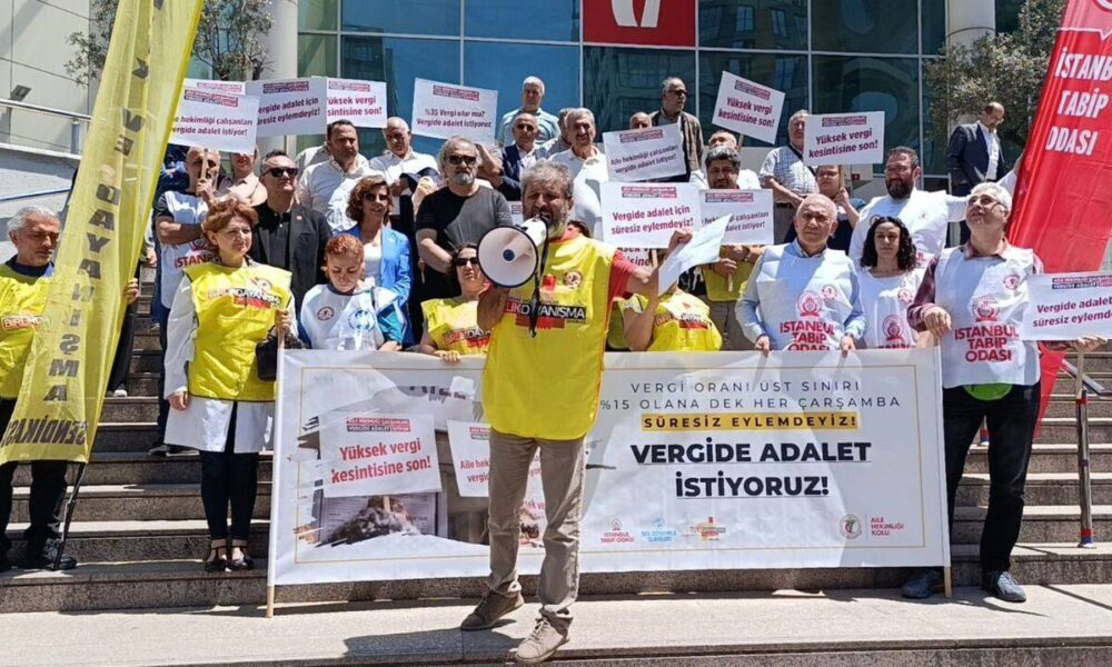 İstanbul’da Ümraniye Vergi Dairesi önünde yapılan açıklamada da Birlik ve Dayanışma Sendikası 1 Nolu Şube Yönetim Kurulu Başkanı Dr. Ahmet Tabduk Mehlepçi, kamu çalışanlarının yüzde 35’lere varan vergi yükü karşısında ezildiğini söyledi. “12 Ayın 5 ayını vergi için çalışıyoruz” diyen Dr. Ahmet Tabduk Mehlepçi, aile hekimlerinin servetleri 500 milyon dolarlarla ifade edilen Cengiz Holding’in ortaklarından bile daha fazla vergi verdiğine işaret etti.