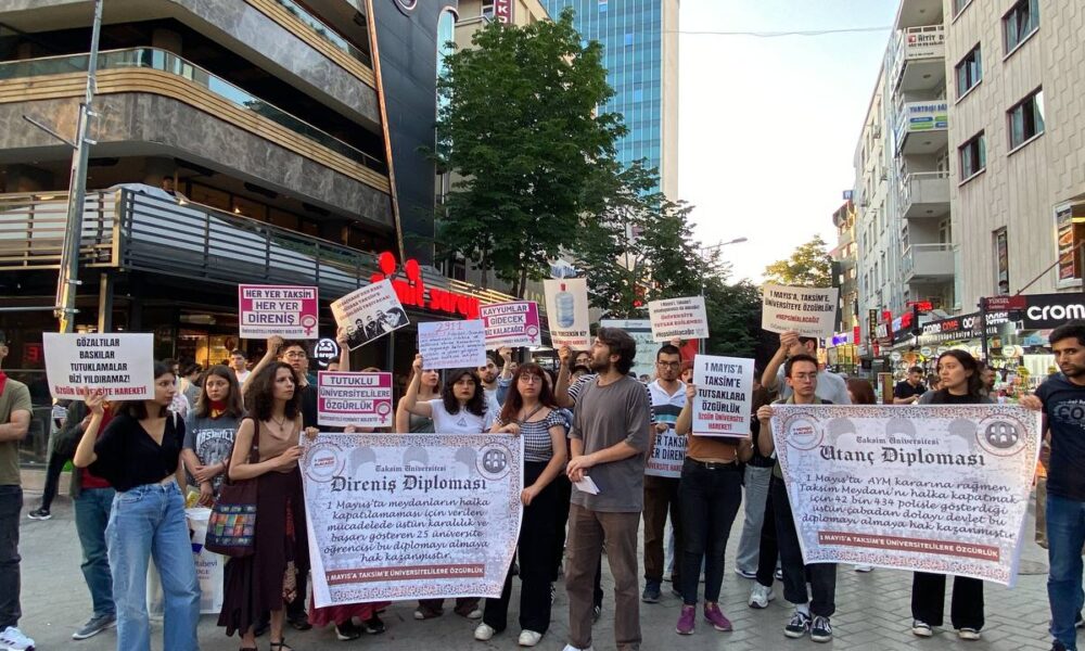 1 Mayıs’a, Taksim’e, üniversitelilere özgürlük” diyenler Ankara’da Kızılay Yüksel Caddesi’nde bir araya geldi. Eylemde iki tane pankart açıldı. Bir pankart 1 Mayıs direnişçilerine atfen üzerinde “Direniş Diploması” yazılı şekilde, diğeri de devlete atfen “Utanç Diploması” yazılı şekilde. Üniversiteliler basın açıklamasından sonra tutsak olan üniversiteliler için özgürlük talebiyle kepler atıldı.