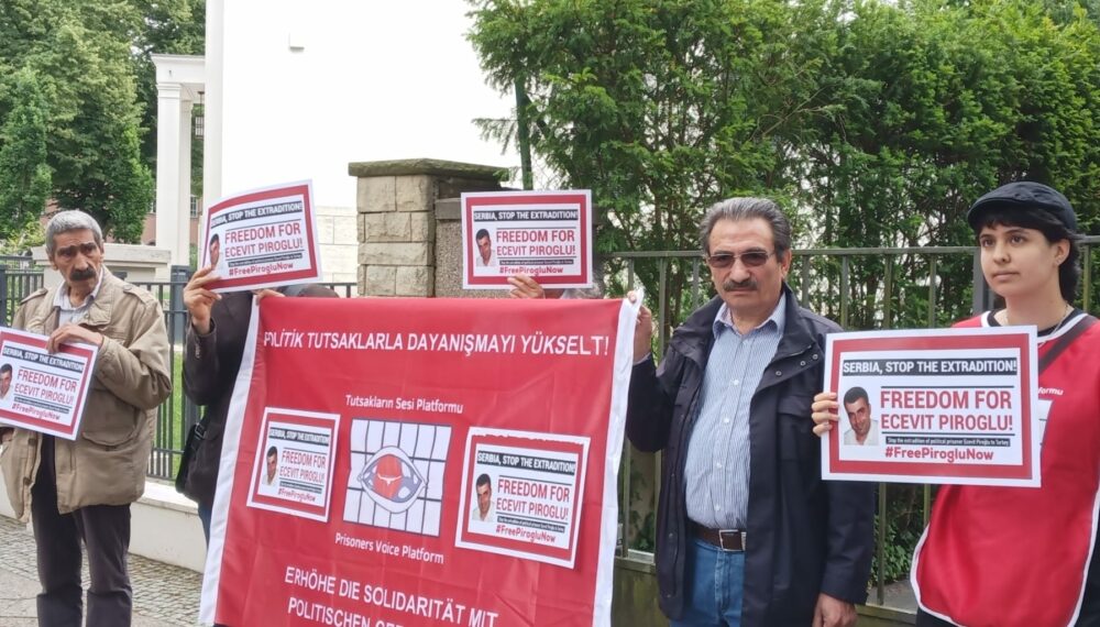 Berlin’de Sırbistan Büyükelçiliği önünde 2021’den bu yana Sırbistan’da Türk devletine teslim edilmek için rehin tutulan Ecevit Piroğlu’nun serbest bırakılması için eylem yapıldı.