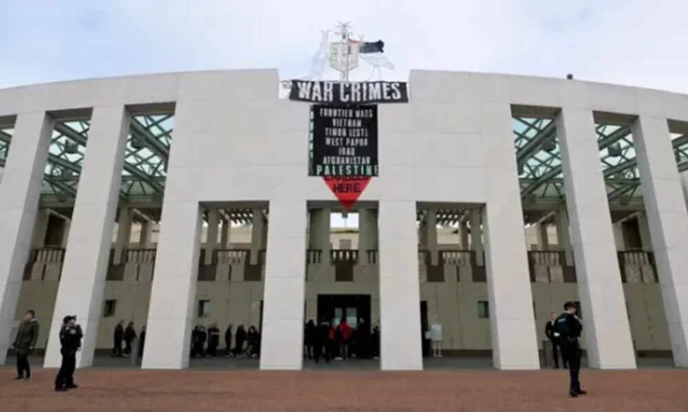 Avustralya Parlamentosu’nda Filistin’e destek eylemi yapıldı. Parlamento binasına “Nehirden denize özgür Filistin” pankartı asıldı