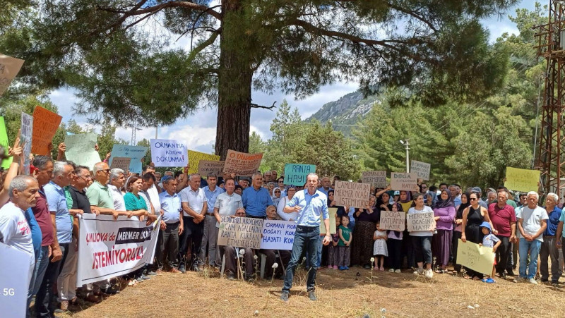 Gazete Duvar’dan Ceren Deniz’e konuşan Kaş Çevre ve Kültür Derneği Başkanı Ahmet Murat Akoy, prosedür gereği halkın projeyle ilgili bilgilendirilmesi için dün planlanan toplantıyı protesto için alana gittiklerini belirterek, “Bugün Çevre Şehircilik ve İklim Değişikliği Bakanlığı’ndan yetkililer geldiler, Çamlıova’dan köylü toplandı. Kaş ve Kalkan’ın mahallelerinden yaklaşık 250 kişi alanda bir araya geldi. Kaş Meclisi partiler üstü bir şekilde meclis üyeleriyle toplantıya katıldı. Tüm partilerden temsilciler de katıldı. Herkes bu mermer ocağını istemedikleri için toplantıya katılmayacaklarını söyledi. Çamlıova Muhtarı, sivil toplum örgütlerinden temsilciler ve meclis üyeleri söz aldı. Hep bir ağızdan bu verimli orman arazisindeki ağaçların kesilmesine göz yumulmayacağı söylendi” dedi.