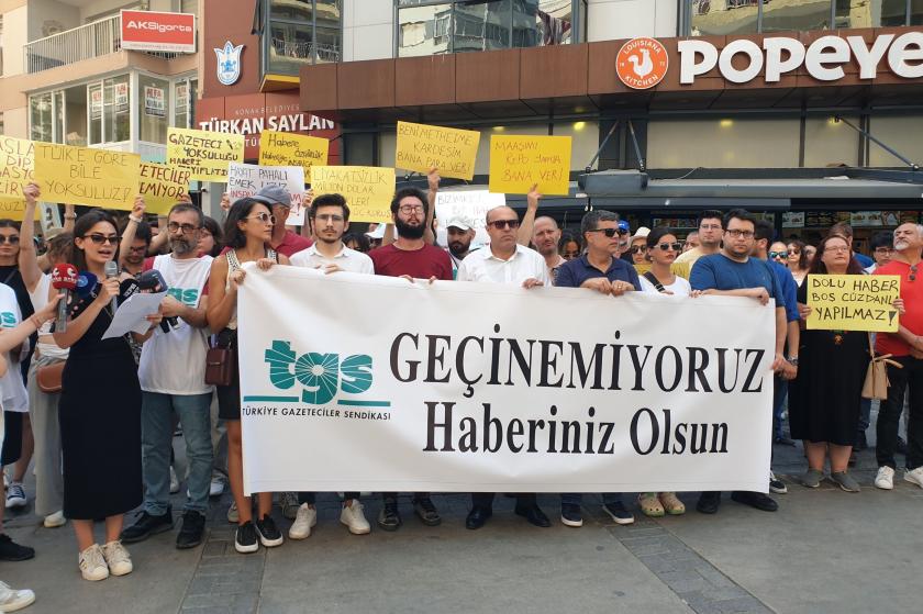 İzmir’de gazeteciler, “Geçinemiyoruz, haberiniz olsun” diyerek eylem düzenledi. Alsancak Kıbrıs Şehitleri Caddesi’nde yer alan ÖSYM ana binası önünde toplanan gazeteciler “Özgür basın susturulamaz”, “Herkesin sesi basın emekçisi”, “İş, ekmek yoksa haber de yok” sloganları ile Türkan Saylan Kültür Merkezi önüne yürüdü.