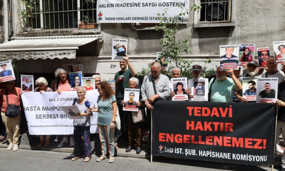 İnsan Hakları Derneği (İHD) İstanbul Şubesi Hapishaneler Komisyonu tarafından hasta tutsaklar için her hafta yapılan “F Oturumu” eylemi 644’üncü haftasında İHD İstanbul Şube binası önünde gerçekleştirildi. Bu haftaki eylemde, halen Bakırköy Kadın Kapalı Hapishanesi’nde tutulan ve yüzde 70 engelli raporu bulunan ağır hasta tutsak Hatice Yıldız’ın durumuna dikkat çekilerek serbest bırakılması istendi. “Tedavi haktır engellenemez” ve “Hasta mahpus serbest bırakılsın” pankartlarının açıldığı açıklamada sık sık, “Hasta tutsaklar serbest bırakılsın”, “Hatice Yıldız serbest bırakılsın” ve “Tecrit öldürür dayanışma yaşatır” sloganlarının atıldığı açıklamada hasta tutsakların fotoğrafları taşındı.