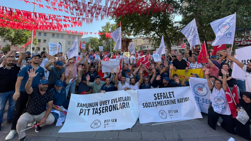 PTT taşeron işçileri Bursa’da PTT-Sen öncülüğünde bir araya geldi. Kadro, eşit işe eşit ücret talebi; sefalet ücretlerine, ağır çalışma koşullarına, sendikal haklara ve sendikalı işçilere yönelik işten atma saldırılarına karşı yüzlerce işçi, “Kamunun üvey evlatları, PTT taşeronları”, “Sefalet sözleşmelerine hayır” pankartları açtı.