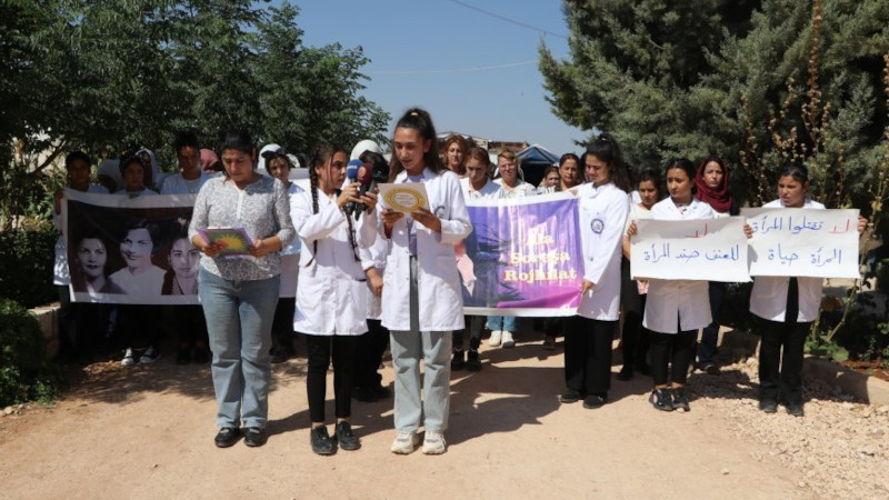 Hindistan’ın Kalküta şehrinde 9 Ağustos günü bir stajyer doktorun tecavüze uğradıktan sonra katledilmesine tepkiler sürüyor. Kuzey ve Doğu Suriye’nin Efrîn-Şehba Kantonu’nda sağlık emekçisi kadınlar süren direnişe destek vermek için basın açıklaması yaptı. Kanton meclis binası önünde yapılan açıklamayı Efrîn-Şehba Meclisi üyesi Şîlan Şêxo okudu.