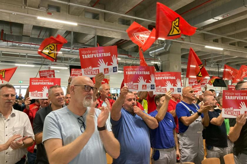 VW yönetimi, hafta başında yaptığı açıklamada, satışların düşmesi nedeniyle Almanya’da isim vermeden bir fabrikanın kapatılabileceğini ve iş yerinin durumuna bağlı olarak işten çıkarmaların olabileceğini duyurmuştu. Yönetimin ilan ettiği bu plana tepki gösteren işçiler fabrika içinde “İş güvenliğimizden elinizi çekin”, “VW’yi yaratan siz değil biziz” ve “Krizin sorumlusu işçiler değil, yöneticiler” yazılı pankartlar taşıdılar. Toplantıya katılan VW yönetiminin “Gerekirse maaşları düşüreceğiz” şeklindeki açıklamalarına tepki gösteren işçiler, öncelikle yöneticilerin maaşlarında kesinti yapılmasını talep ettiler.