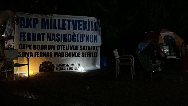 Manisa’nın Soma ilçesinde AKP Batman milletvekili Ferhat Nasırlıoğlu’nun sahibi olduğu Fernas Madencilik’te, Bağımsız Maden İş sendikasına üye olduğu için işten çıkarılan işçilerin direnişi sürüyor. Direnişi Nasıroğlu’nun Bodrum’daki oteli Cape Bodrum Luxury’nin önüne taşıyan maden işçileri, nöbetin ikinci gününde jandarma saldırısıyla gözaltına alındı.