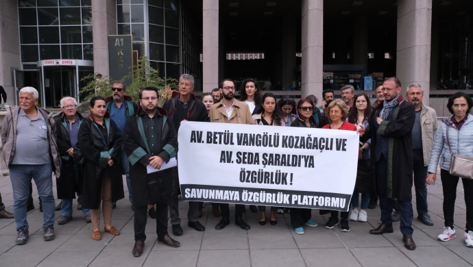 Savunmaya Özgürlük Platformu üyeleri, yaklaşık 7 aydır tutuklu olan Çağdaş Hukukçular Derneği üyesi avukatlar Betül Vangölü ve Seda Şaraldı’nın yarın görülecek duruşmalarına ilişkin açıklama yaptı. Ankara Adliyesi önünde Platform üyeleriyle açıklama yapan ÇHD Ankara Şube Yönetim Kurulu Üyesi Av. Fatih Gökçe, avukatların mesleklerini icra ettikleri hukuk bürolarında gözaltına alındığı, hukuka aykırı arama faaliyetleri yapıldığı ve aynı şekilde dijitallere el konulduğunu belirtti.