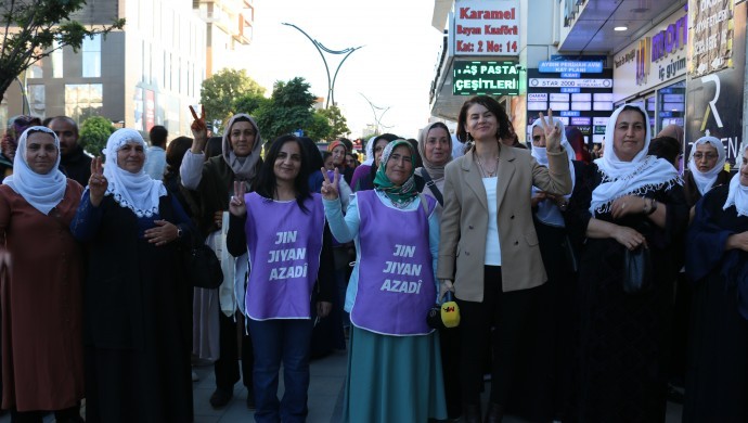 Açıklamayı yapan DEM Parti Wan Milletvekili Gülcan Kaçmaz Sayyiğit, komployu kınayarak sözlerine başladı. Sayyiğit, “Bu topraklarda yıllardır bir savaş politikası yürütülüyor. Bu savaş politikası ile beraber 26 yıldır tutsak edilen ve 43 aydır üzerinde tecrit politikası uygulanan Sayın Abdullah Öcalan için 13 Ekim Amed’in İstasyon Meydanında Özgürlük Mitingi gerçekleştireceğiz. Biz bu toprakların sahibi olarak şunu ifade ediyoruz, bu topraklarda yaşayan tüm halklarla özgür ve eşit bir yaşamı, barış içerisinde inşa etmek için hazırız ve her zaman bunun için mücadele edeceğiz. Eğer bu topraklara barış gelecekse, savaş son bulacaksa bunun birinci derece muhatabı Sayın Abdullah Öcalan’dır. O yüzden Sayın Öcalan üzerinden açığa çıkarılmış olan bu tecrit politikalarının son bulması, bu mutlak iletişimsizlik halinin son bulması ve bu topraklarda onurlu, eşit ve adil bir yaşamın inşa edilmesi için biz TJA kadınlar olarak, ‘Jin jiyan azadî’ felsefesinin bize verdiği güçle Amed’de olacağız. Barış ve demokrasi isteyen tüm sivil toplum kuruluşlarını, tüm demokratik kitle örgütlerini ve tüm halkımızı 13 Ekim’de Amed İstasyon Meydanında bekliyoruz” dedi.