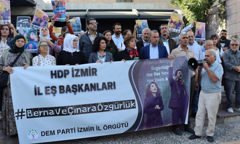 Duruşma sonrasında karar adliye önünde “Berna ve Çınar yalnız değildir”, “Baskılar bizi yıldıramaz” ve “Berna ve Çınar’a özgürlük” sloganlarıyla protesto edildi. Adliye önünde konuşan DEM Parti İzmir İl Eş Başkanı Vezan Karabulut, tutuklulara adeta düşman hukuku uygulandığını vurgulayarak, “İçeride bir komedi oynandı. Tamamen düzmece ve kurmaca bir iddianame hazırlanmış. Eş başkanlarımız tamamen siyasi faaliyet yürüttüğü için yargılandı. Cezaevindeki tüm siyasi tutsaklar özgür olana kader mücadelemizi sürdüreceğimizi yineliyoruz” dedi.