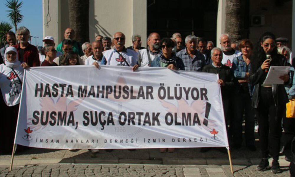 İnsan Hakları Derneği (İHD) İzmir Şubesi Hapishane Komisyonu, hasta tutukluların durumuna dikkat çekmek amacıyla 2 haftada bir düzenlediği eylemin 298’incisini Konak Eski Sümerbank önünde gerçekleştirdi. Çok sayıda kişinin katıldığı eylemde, “Hasta mahpuslar ölüyor, susma, suça ortak olma” pankartı açıldı. Bu haftaki eylemde, Gebze Kadın Kapalı Cezaevi’nde tutulan İHD İstanbul Şubesi Hapishane Komisyonu üyesi ve hasta tutsak Hatice Onaran’ın (60) durumuna dikkat çekildi.