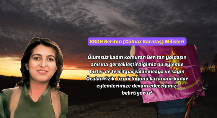Türkiye ve Kürdistan Halklarının içinden geçmekte olduğu bu tarihi günlerde kadınlar başta olmak üzere Kürt halkı, gerillası, siyasi iradesi ve dünya çapında dostları ile birlikte İmralı Hapishanesinde devam eden ağırlaştırılmış tecrit ve işkence sistemini protesto ediyor, Kürt Halk Önderi Sayın Abdullah Öcalan’ın etrafında kenetlenerek onun özgürlüğünü haykırıyor. Ölümsüz kadın komutan Beritan yoldaşın anısına gerçekleştirdiğimiz bu eylemle bizler de tecrit parçalanıncaya ve sayın Öcalan fiziki özgürlüğünü kazanana kadar eylemlerimize devam edeceğimizi belirtiyoruz!