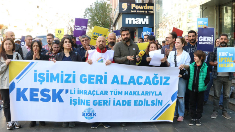KESK Diyarbakır Şubeler Platformu, KHK ile gerçekleşen ihraçların 9’uncu yılı dolayısıyla Ofis semtinde bulunan ACZ Plaza önünde açıklama yaptı. “İşimizi geri alacağız. KESK’li ihraçlar tüm haklarıyla işine geri iade edilsin” pankartı açılan eylemde, “Yaşamı savunduk”, “Geri döneceğiz”, “KHK’ler iptal edilsin” dövizleri taşındı.