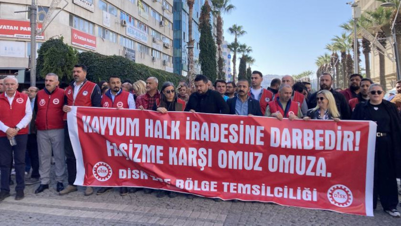 DİSK Ege Bölge Temsilcisi Memiş Sarı, en temel demokratik haklardan biri olan seçme ve seçilme hakkının kayyum uygulamalarıyla gasp edildiğini belirtti.