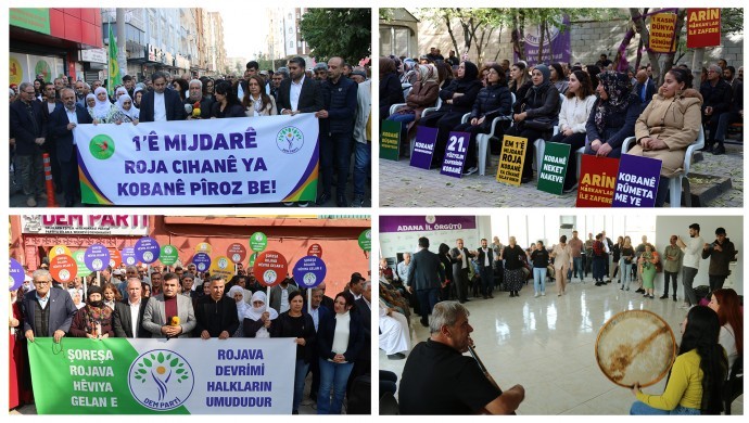 DEM Parti Adana İl Örgütü’nde Kobanê Günü kapsamında kutlama yapıldı. Saygı duruşuyla başlayan etkinlikte konuşan DEM Parti Adana İl Eşbaşkanı Seyfettin Aydemir, ” Kobanê direnişinin ruhu ve yarattığı aydınlık söndürülemez. Bu aydınlığa olan inancımızla özgürlüğümüzden, haklarımızdan ve kazanımlarımızdan asla geri adım atmayacağız. Kobanê direnişinin halklar için yarattığı bahara sahip çıkacağız. Kobanê’de insanlığı karanlığa sürüklemek isteyenlere karşı direnenlerin yaktığı meşale; eşitlik ve özgürlük savunucularının yolunu bugün de aydınlatmaya devam ediyor. Bu şanlı direnişin 11’inci yıldönümünde, IŞİD karanlığını yırtan, geleceği aydınlatan direniş meşalesini, dünya halklarının enternasyonalist dayanışma ruhunu selamlıyoruz, Dünya Kobanê Günü’nü kutluyoruz” dedi.