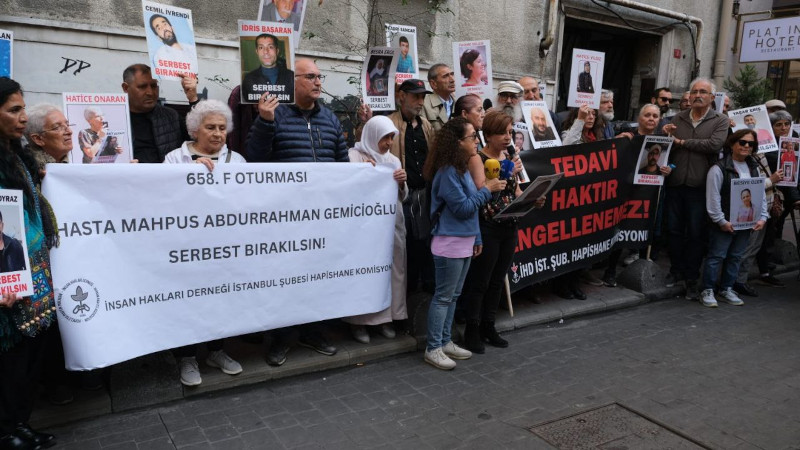 İnsan Hakları Derneği (İHD) İstanbul Şubesi, 658. F oturmasında Beyoğlu’nda bulunan dernek binası önünde yan yana geldi. “Tedavi haktır engellenemez” ve “Hasta mahpus Abdurrahman Gemicioğlu serbest bırakılsın” pankartları açılan eylemde hasta tutsakların fotoğrafları taşındı.
