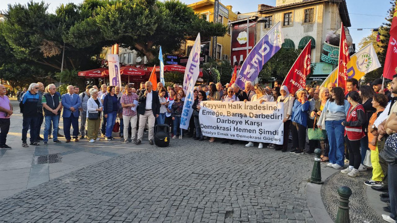 Antalya Emek ve Demokrasi Güçleri, Attalos Meydanında kayyum darbesine karşı bir araya geldi. Kayyumun halk iradesine, emeğe, barışa darbe olduğunun altını çizen çok sayıda kişi bu durumu kabul etmeyeceklerini, direneceklerini söyledi.