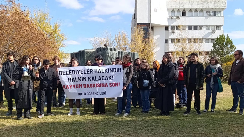Ortadoğu Teknik Üniversitesi öğrencileri, Batman, Mardin ve Halfeti’ye kayyum atanarak halk iradesinin gasp edilmesine karşı kampüs içerisinde eylem yaptı. Eylemde, “Belediyeler halkındır, halkın kalacak! Kayyum baskısına son” pankartı açıldı.