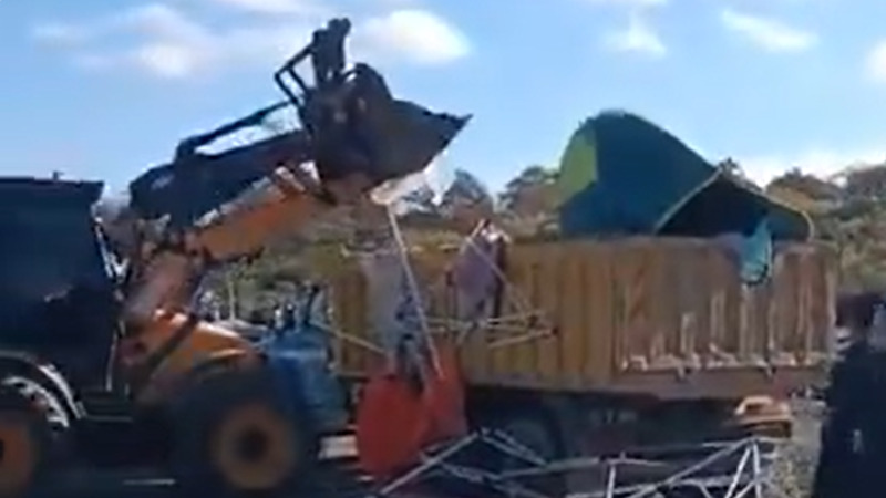 Nöbet alanına yönelik saldırıda hayvan hakları savunucularının kişisel eşyalarının bulunduğu çadır ve tenteler vinç ile birlikte yerle bir edildi.