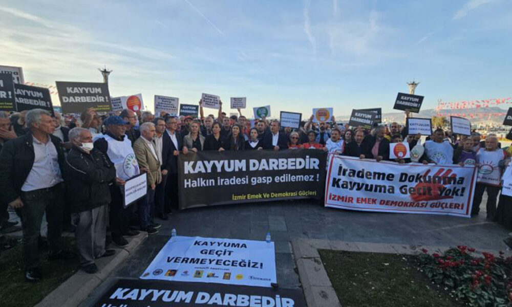 İzmir Emek ve Demokrasi Güçleri, Halkların Eşitlik ve Demokrasi Partisi (DEM Parti) yönetimindeki üç belediyeye kayyım atanmasını, gerçekleştirdikleri basın açıklamasıyla protesto etti. Cumhuriyet Meydanı’nda yapılan basın açıklamasında “İrademe dokunma kayyıma geçit yok” yazılı pankart ve “Kayyım halk iradesine darbedir”, “İrade gaspına karşı direnerek kazanacağız”, “Berxwedan de bi ser bikeve” yazılı dövizler taşınırken sık sık “Kurdîstan gorîstan ji bo faşîstan”, “Kayyım darbedir darbeye hayır” ve “Faşizme karşı omuz omuza” sloganları atıldı. Eyleme DEM Parti İzmir Milletvekilleri İbrahim Akın ve Burcugül Çubuk, çok sayıda siyasi parti, sivil toplum kuruluşu ve yurttaş katıldı. Basın metnini kitle adına İzmir Barosu Başkan Yardımcısı Zöhre Dalkıran okudu.