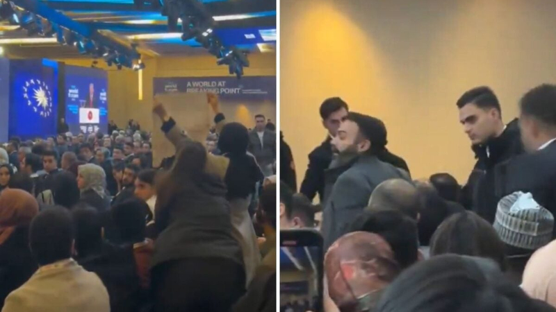 İstanbul Kongre Merkezi’nde 29 Kasım günü düzenlenen TRT World Forum’unda Erdoğan’ın konuşması sırasında Filistin İçin Bin Genç grubundan bir kadın, “Azerbaycan petrolü neden İsrail’e gidiyor” diyerek eylem yaptı. Bir başka protestocu da Erdoğan’a, “Siyonistler ticaretini denizlerimizde ve limanlarımızda sürdürürken gemiler Gazze’ye bomba taşıyor” diyerek tepki gösterdi. Bunun üzerine Erdoğan, “Yavrum siyonistlerin burada dili ağzı olma” diyerek durumu çarpıtmaya çalıştı. Protesto eden kişi, ağzı kapatılarak ve darp edilerek salondan çıkarıldı.