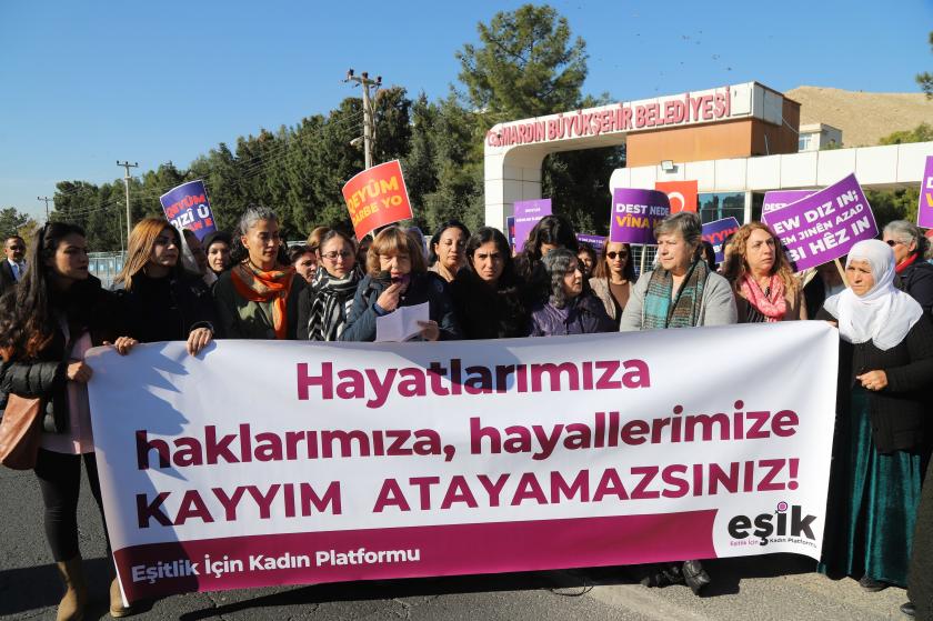 Eşitlik İçin Kadın Platformu öncülüğünde Mardin’de bir araya gelen kadınlar, belediyelere kayyım atanmasını yürüyüşle protesto etti. Yürüyüşe, Halkların Eşitlik ve Demokrasi Partisi milletvekilleri Saliha Aydeniz, Berîtan Güneş Altın da katıldı.