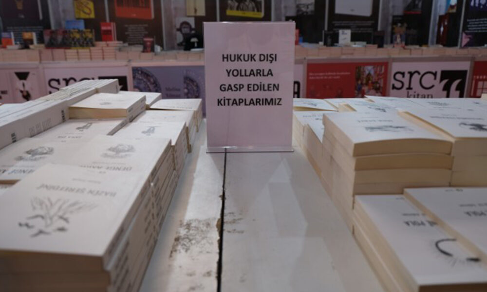 Amed 8. Kitap Fuarı’nda polisler, ‘Kadın olmak’ kitabına da el koydu. Aram Yayınevi, boş kalan bölüme ‘Hukuk dışı yollarla gasp edilen kitaplarımız’ yazısı bıraktı